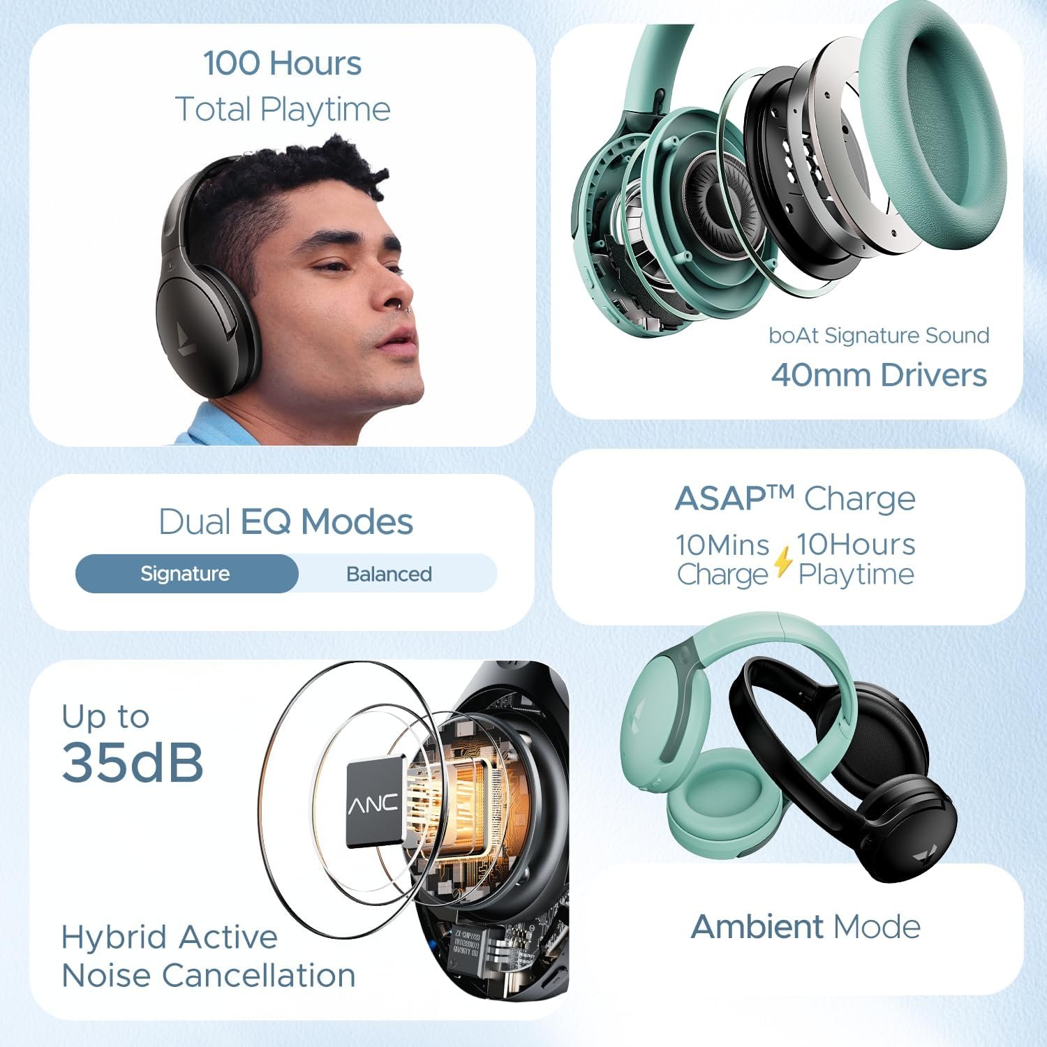 • Playback-Stay connected to your playlist for mammoth durations, every day with up to 70 hours of playtime in ANC mode and up to 100 hours in normal playback mode.